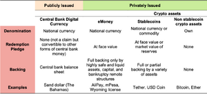 - the type of backing: including reserve assets of varying degrees of stability and liquidity regarding which end-users may have a direct legal claim, as well as additional public backstops such as access to emergency liquidity.[17]