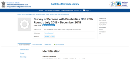 This government-backed dataset, analyzed by the Institute of Economic Growth, Delhi, is among the most comprehensive statistical sources tracking the prevalence, causes, and social patterns of disability in India. The term “disability” is defined in accordance with the RPWD Act, 2016—as long-term physical, mental, intellectual, or sensory impairments that, in interaction with barriers, hinder equal participation in society. The NSS 76th Round captures disability by type (e.g., locomotor, hearing, visual, speech, mental illness, intellectual disability, others) and links it with socio-demographic factors such as age, gender, education, marital status, sector (rural/urban), and economic quintile.