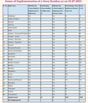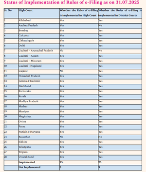 The e-Committee Newsletter (July 2025) records that e-filing rules have been implemented in 25 jurisdictions, covering both High Courts and District Courts. Arunachal Pradesh, the High Court of Gujarat, and Rajasthan had not implemented these rules by that date[10].