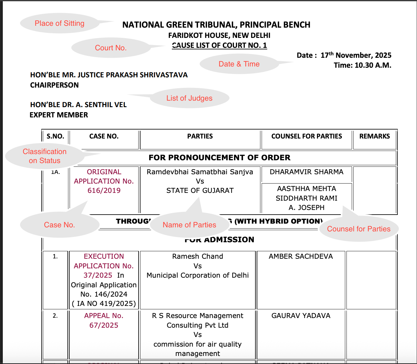 A screenshot of the Principal Bench - I cause list for 17.11.2025, with key elements highlighted.