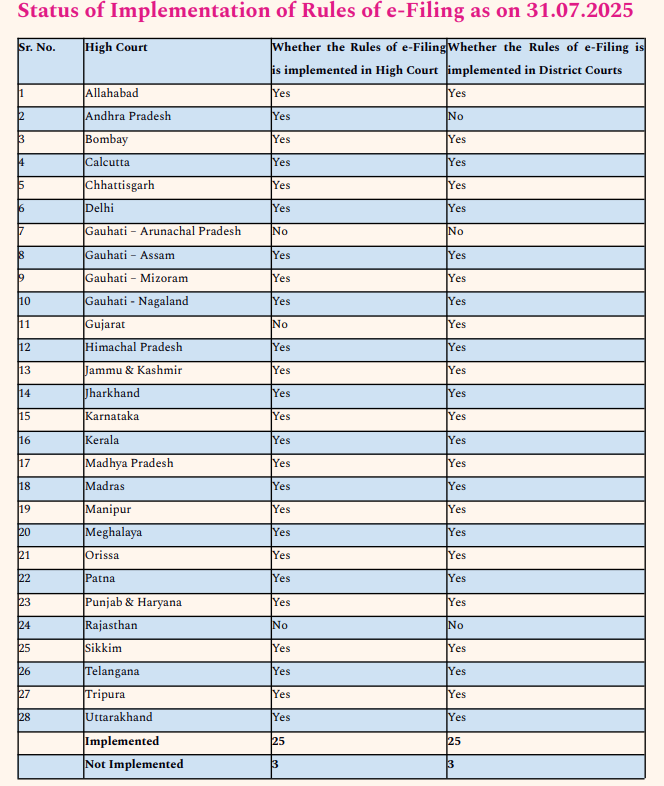 "Status of Implementation of Rules of e-Filing across Indian High Courts and District Courts as of 31 July 2025. The data shows that 25 High Courts and 25 District Court systems have implemented e-Filing Rules, while 3 High Courts and 3 District Court systems remain non-implemented.” Appeared in e-Committee Newsletter of July 2025 https://ecommitteesci.gov.in/publication/e-committee-newsletter-july-2025/."