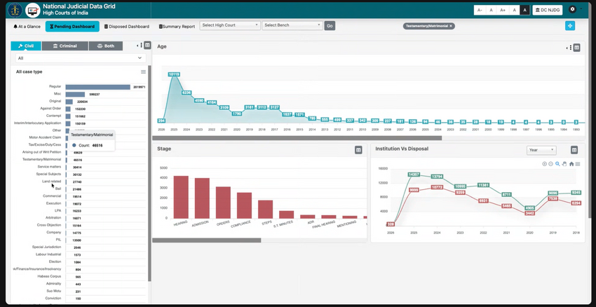 Probate matters in India are primarily recorded and tracked under the “testamentary” category within the National Judicial Data Grid (NJDG), reflecting their origin as disputes arising from wills, estates, and succession issues. Under the NJDG’s classification system, these cases fall into a sub-group of civil matters that specifically relate to probate, letters of administration, and other testamentary petitions. At the high court level, testamentary jurisdiction encompasses the vast majority of probate applications, both uncontested and contentious. Here, NJDG classifies matters such as petitions for grant of probate, letters of administration, and related tests-of-validity of wills within the testamentary jurisdiction head, allowing for granular tracking of case pendency, institution rates, and judicial outcomes.